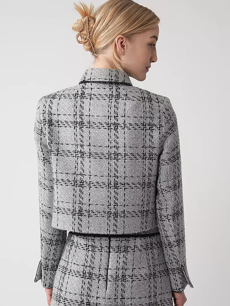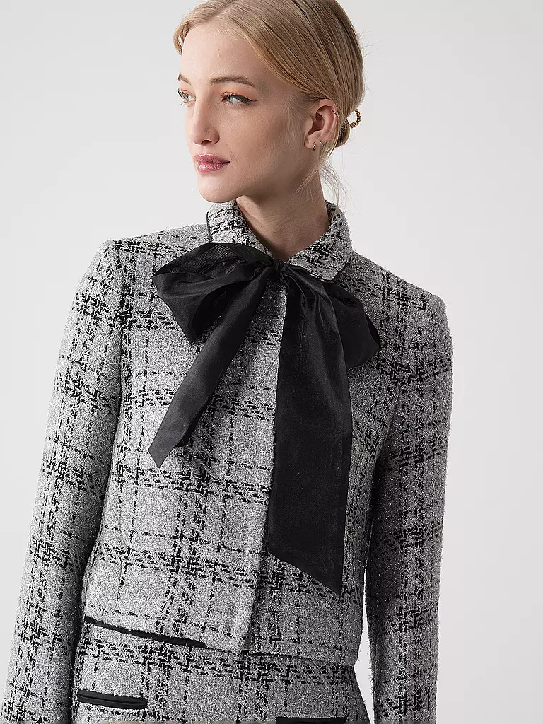 Diese karierte Jacke erhält durch schimmernde Lurex-Details einen Hauch von Exklusivität. Das markante Design wird durch eine große, einfarbige Schleife am Kragen stilvoll akzentuiert. Die figurnahe Cropped-Silhouette und die geschlitzten langen Ärmel verleihen der Jacke eine moderne Note. Verdeckte Druckknöpfe sorgen für einen dezenten Verschluss.